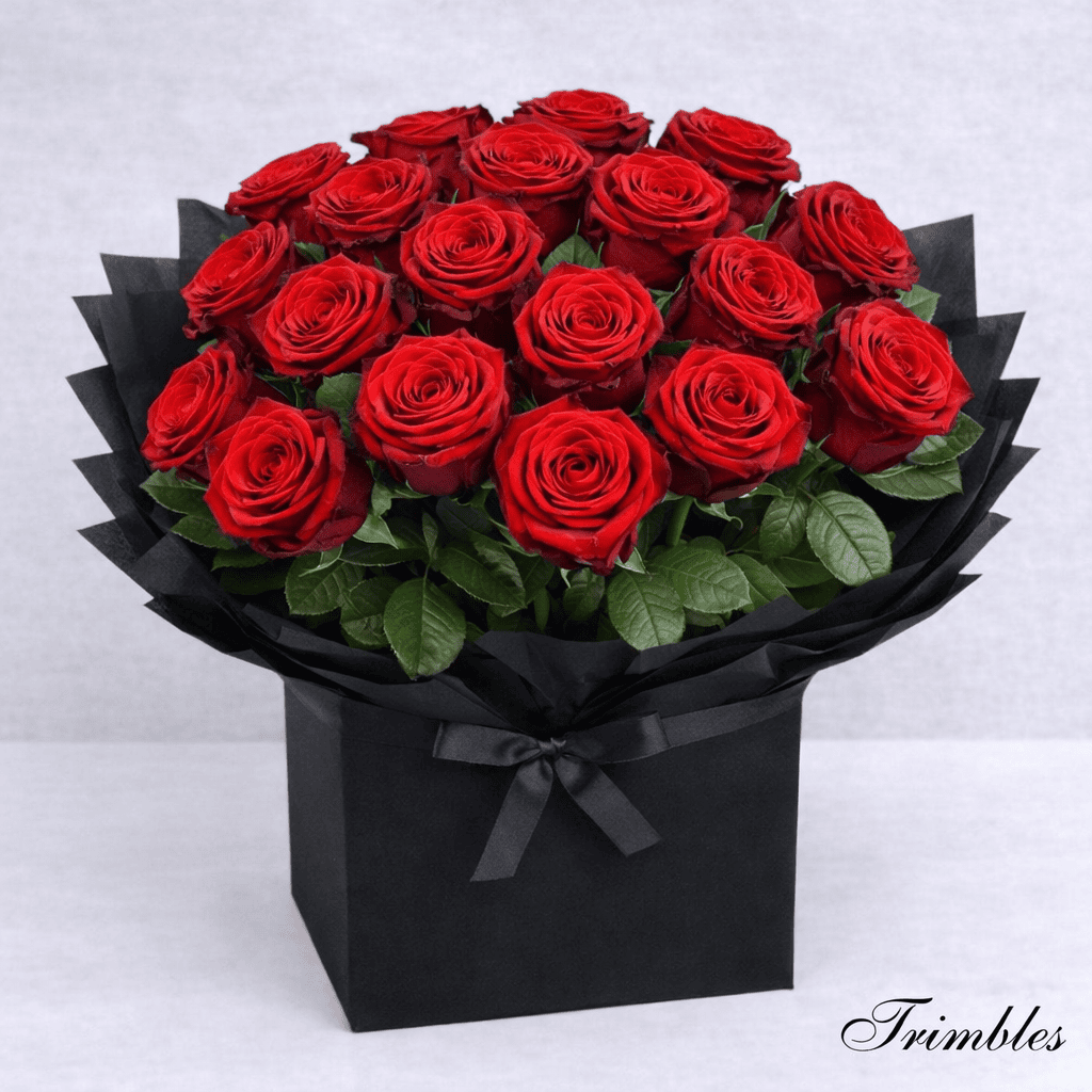 Presented in a sleek black box with a matching black wrap and satin ribbon, this arrangement makes a dramatic statement while keeping the design elegant and refined. The flowers are arranged in floral foam, making it easy to enjoy straight away with minimal care.