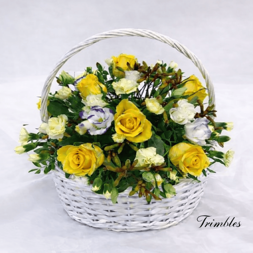 Our Basket of Sunshine is a joyful arrangement designed to lift spirits and brighten any day. Featuring radiant yellow roses at its heart, this cheerful basket is beautifully complemented by elegant lisianthus, fresh seasonal greenery, and a scattering of small, delicate flowers for added texture and charm. Arranged in a classic white basket, it’s a timeless gift full of warmth, colour, and positivity — perfect for birthdays, get-well wishes, or simply to let someone know you’re thinking of them.
