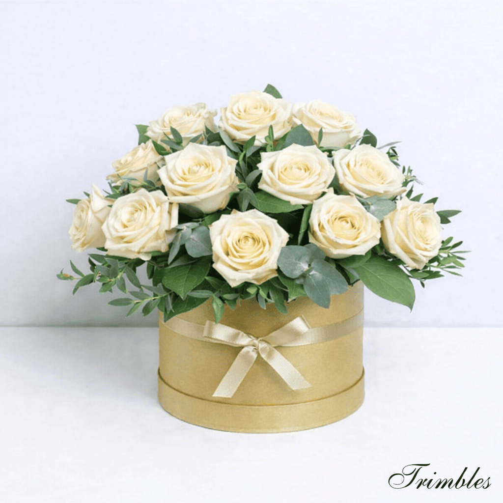 Classic, refined and effortlessly luxurious, this beautiful hatbox arrangement features premium cream roses, expertly arranged with fresh green foliage for a timeless, full-bodied display. Each rose is carefully selected for its soft tone and perfect bloom, creating a calm and sophisticated look.
