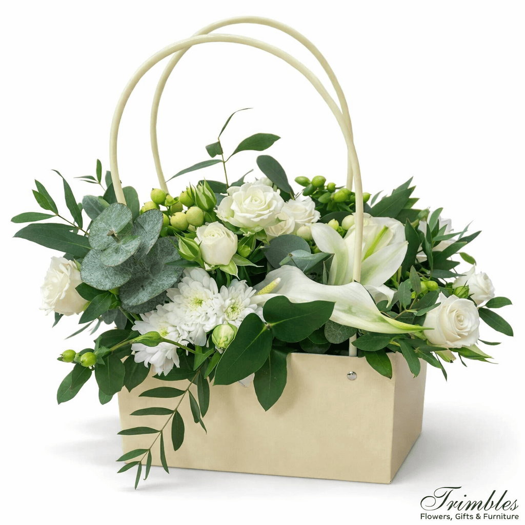 A beautifully arranged handbag-style floral display featuring elegant white roses, fresh white lilies, delicate chrysanthemums, green hypericum berries and lush seasonal foliage. Designed in a structured gift handbag, this arrangement blends timeless whites with rich greenery for a look that feels both modern and effortlessly sophisticated.