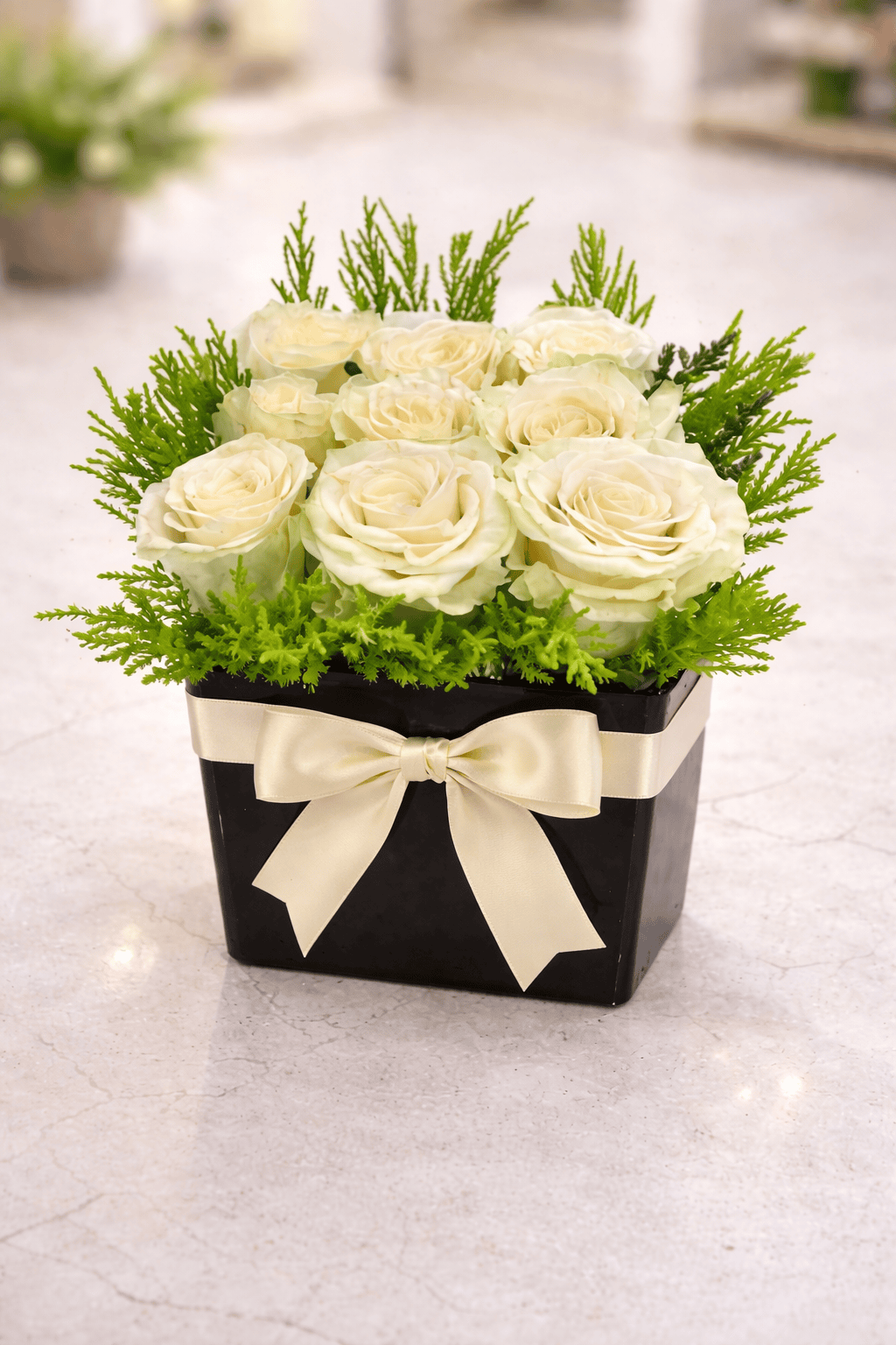A refined and timeless floral design with understated elegance. This arrangement features large cream white Ecuadorian roses, prized for their beauty, size, and long-lasting quality. The roses are carefully set into fresh floral oasis and surrounded by fragrant goldcrest foliage, which adds texture and a subtle natural lemon scent.