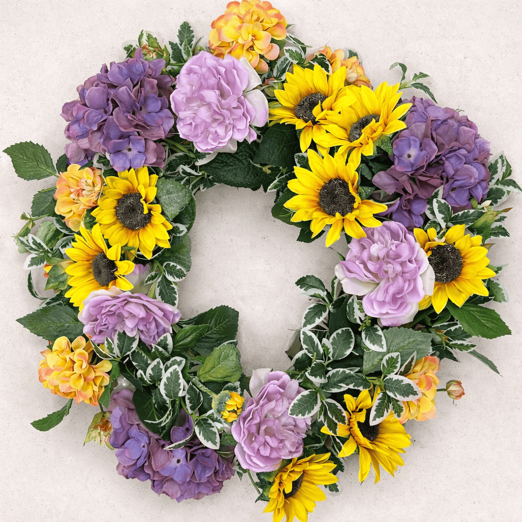 Our Sunlit Meadow Silk Wreath is a joyful, handcrafted silk wreath designed to bring warmth and colour into any space. Featuring vibrant silk sunflowers paired with soft lavender hydrangeas, blush-toned blooms, and variegated green foliage, this wreath offers a fresh, countryside-inspired look with beautiful depth and texture.