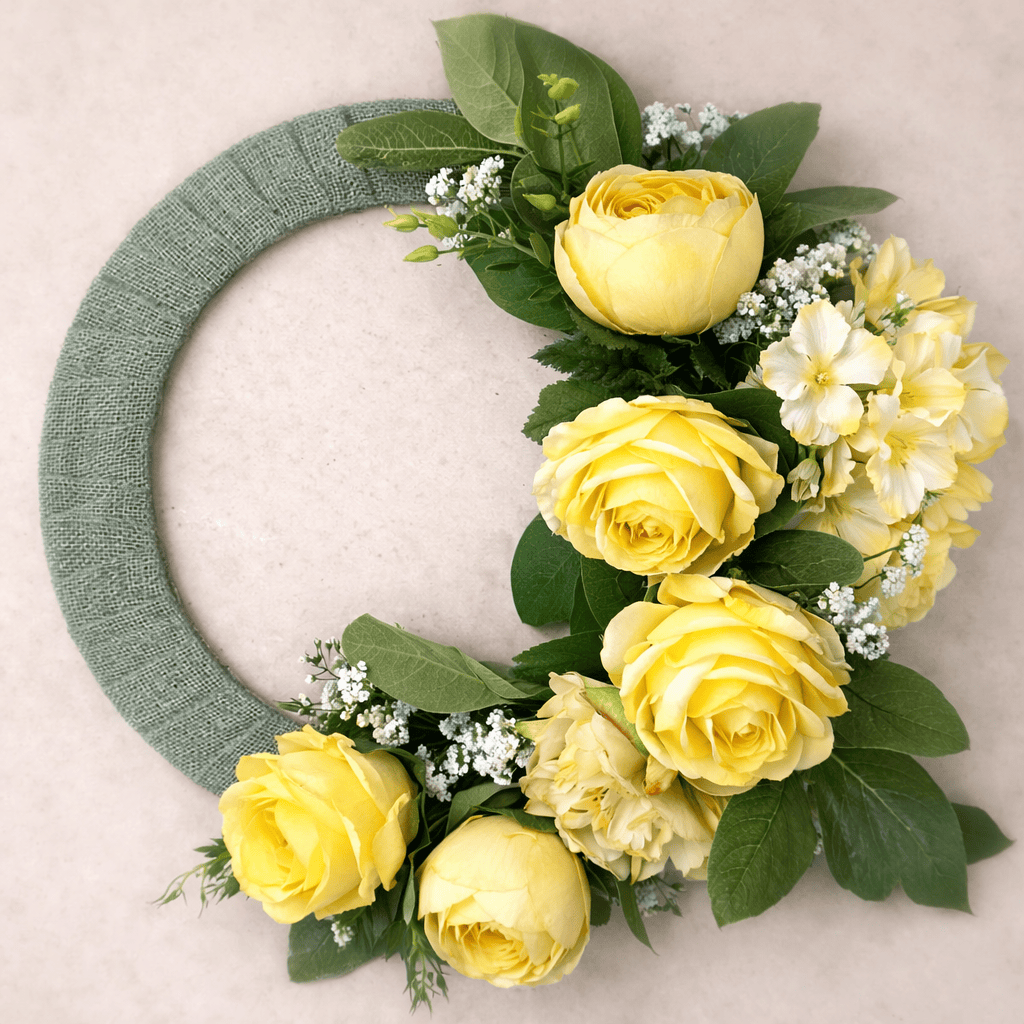 Created in a crescent (half-moon) shape, this wreath offers a softer, more contemporary alternative to the traditional full circle. Carefully arranged with premium florals and foliage, it’s designed for those who want something elegant, modern, and a little bit different.
