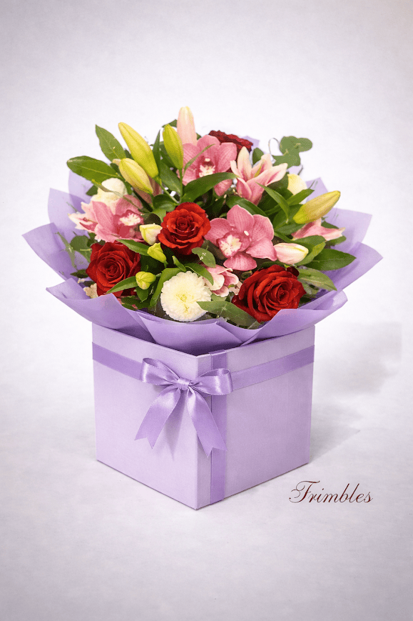 A luxurious and beautifully balanced bouquet featuring rich red roses, soft pink orchids and elegant lilies, thoughtfully arranged with seasonal foliage. Presented in a coordinating gift box and wrap, this design makes a real statement from the moment it’s received.