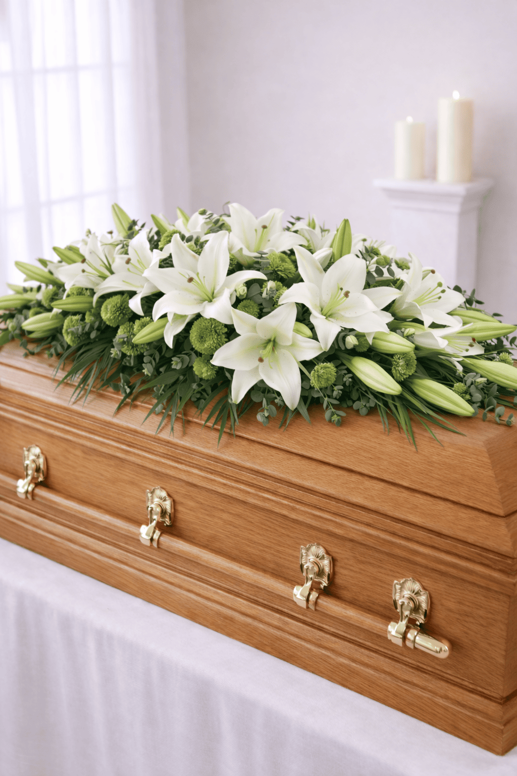 This casket spray features white Oriental lilies, beautifully arranged with complementary greenery to form a flowing, full-length design that rests gracefully on top of the casket. Oriental lilies are chosen for their large blooms, subtle fragrance, and lasting quality, making them a meaningful and dignified choice for a final farewell.