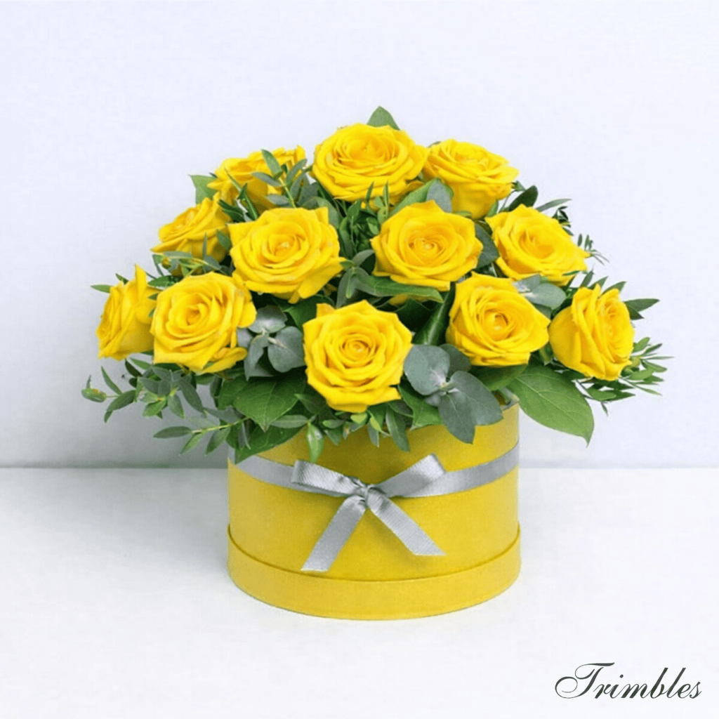 Bright, joyful and full of warmth, this stunning yellow rose hatbox is designed to lift spirits and make a lasting impression. Featuring premium yellow roses, beautifully arranged with fresh green foliage, each bloom is carefully placed to create a full, luxurious dome of colour.